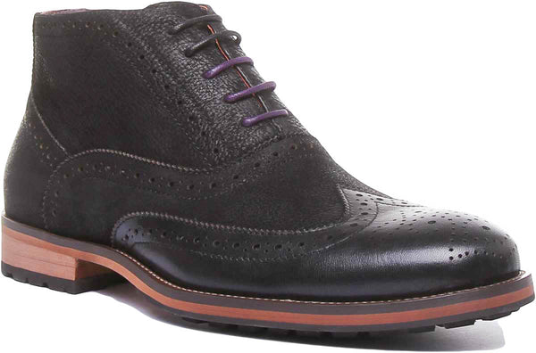 Put a statement in your step with these Justin Reess Bruno mens brogue lace up boots with zip on the side. A beautiful brogue with tan leather upper on a durable leather and rubber sole unit. Lace up closure with zip on the side helps in adjustable fit according to your need. These ankle boots are made to compliment a casual or smart outfit and give you that standout look. Perfect addition to your wardrobe.