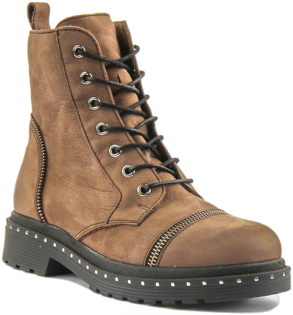 Add some style to your look with this Justin Reess Charlotte military style boots. It features premium leather upper for durability, soft lining for added comfort and lace up closure with side zip for easy on and off. The zip design around the heel and front adds extra style to the whole boot. Perfect boots for any casual occasion.