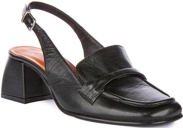 Step out in style and comfort in these slip-on shoes from JUSTINREESS. Made from premium leather upper with open back style, it features block heels and square toe design. It also comes with adjustable buckle closure at the back. Finished with JUSTINREESS branding on the footbed, these shoes will take you from day to evening.
