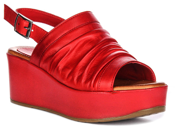 Crafted from premium-quality leather, the outer material showcases a luxurious texture and durability that is built to last. The rich, vibrant red colour adds a bold and confident flair to your ensemble, ensuring you stand out effortlessly. The ruching detail across the upper strap enhances the design with a unique and modern touch, creating a flattering silhouette for your feet.