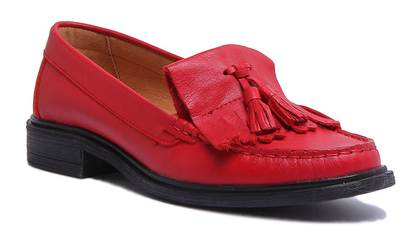 Samantha Slip On Leather Loafer With Fringe In Red