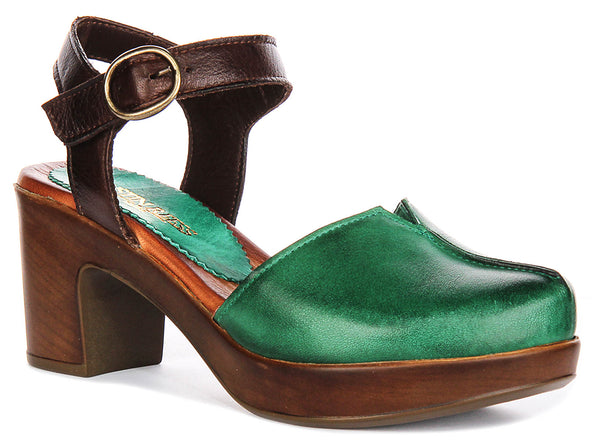 The Sierra mid heels feature a unique and eye-catching two-tone colour scheme. The upper is a vibrant, rich green leather that adds a pop of colour to your outfit, while the contrasting brown leather ankle strap provides a chic and classic touch. The wooden effect on the heel and platform adds an earthy, natural charm, enhancing the overall aesthetic. The adjustable ankle strap with a gold-tone buckle ensures a secure and comfortable fit, while adding a subtle detail of sophistication.