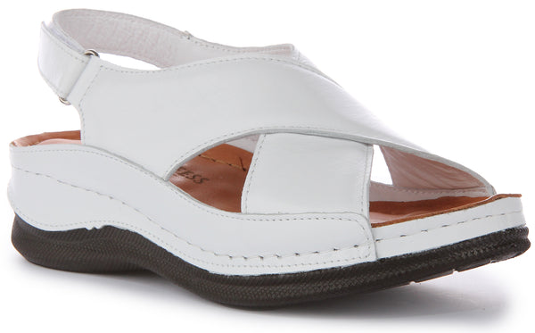 The pristine white color radiates sophistication but also adds versatility to your summer wardrobe, allowing effortless pairing with a myriad of outfits. Crafted with meticulous attention to detail, these leather sandals feature a crossstrap and velcro ergonomic design, ensuring a secure and adjustable fit tailored to your comfort.