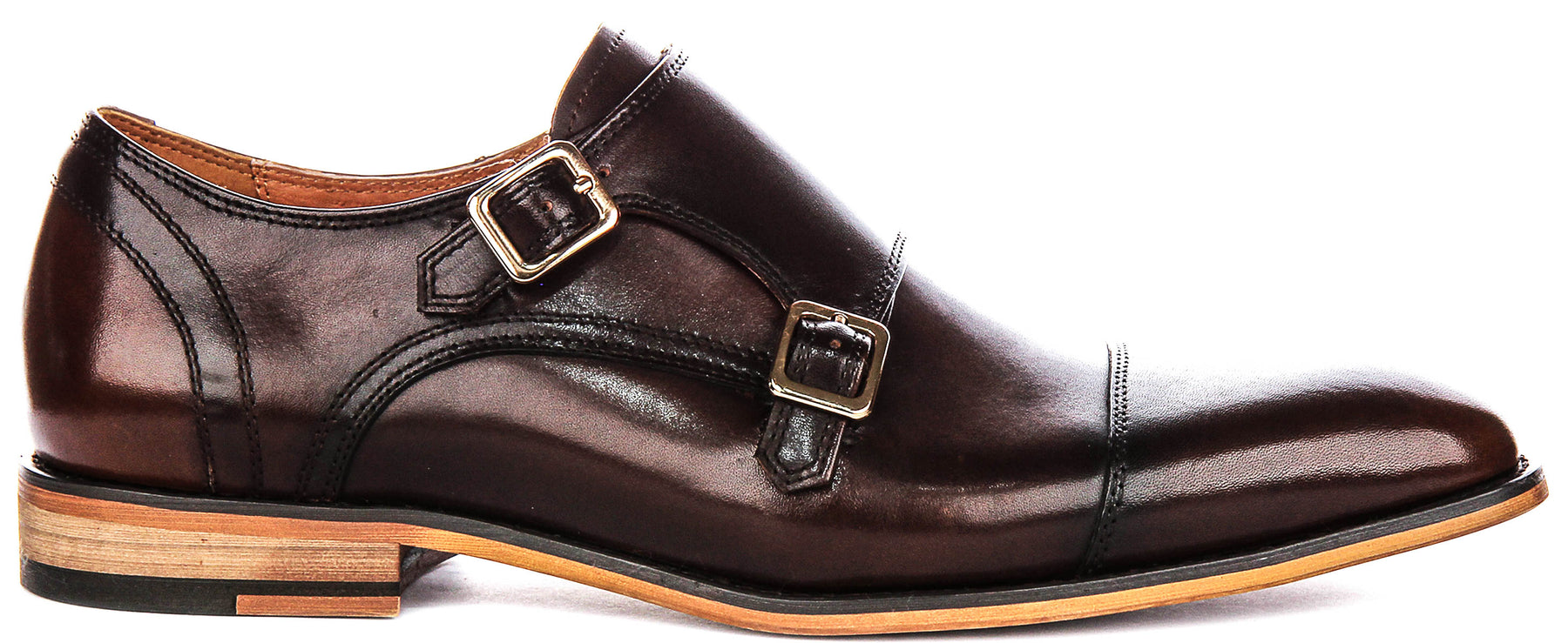 A defining feature of the Donald shoes is their iconic double monk strap design. Two sleek, leather straps elegantly cross the vamp, secured by polished golden-toned buckles that add a touch of refined hardware and sophisticated flair. This unique fastening system not only provides an adjustable and secure fit but also sets these shoes apart from traditional lace-ups. The refined cap toe design is meticulously stitched, adding to the shoe's distinguished profile.