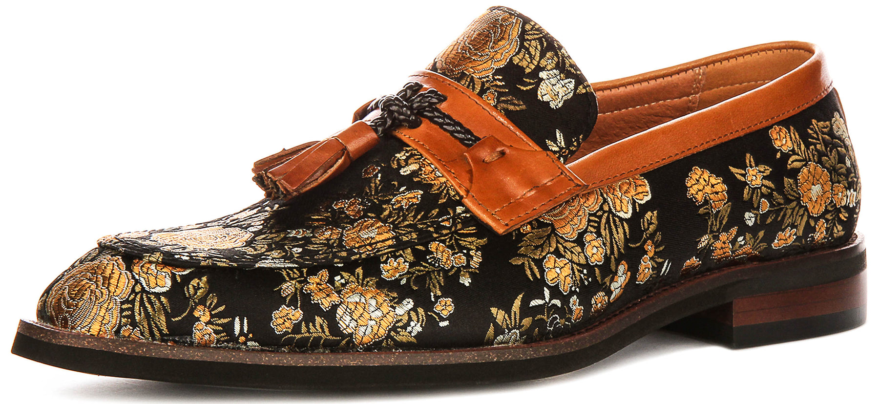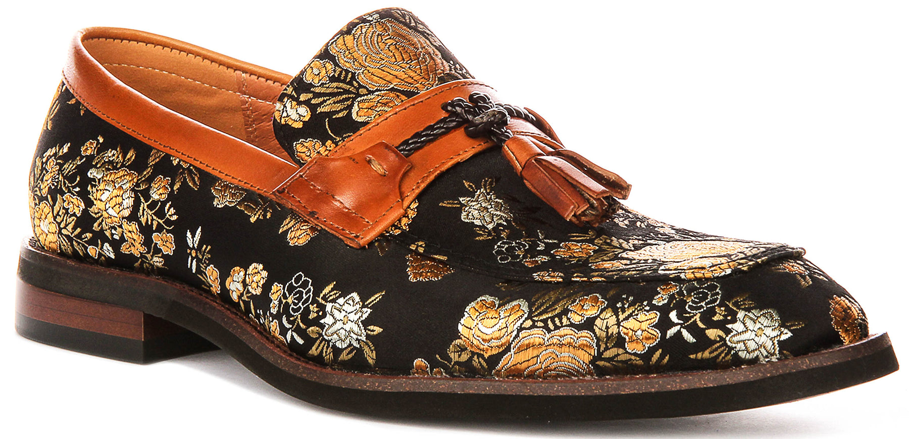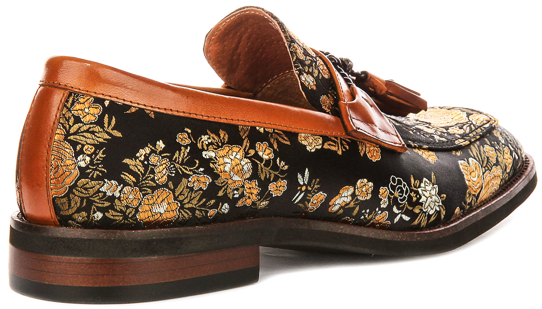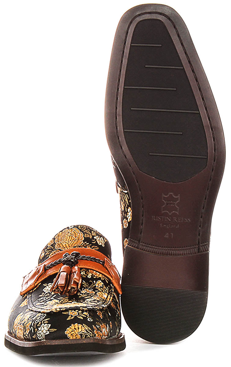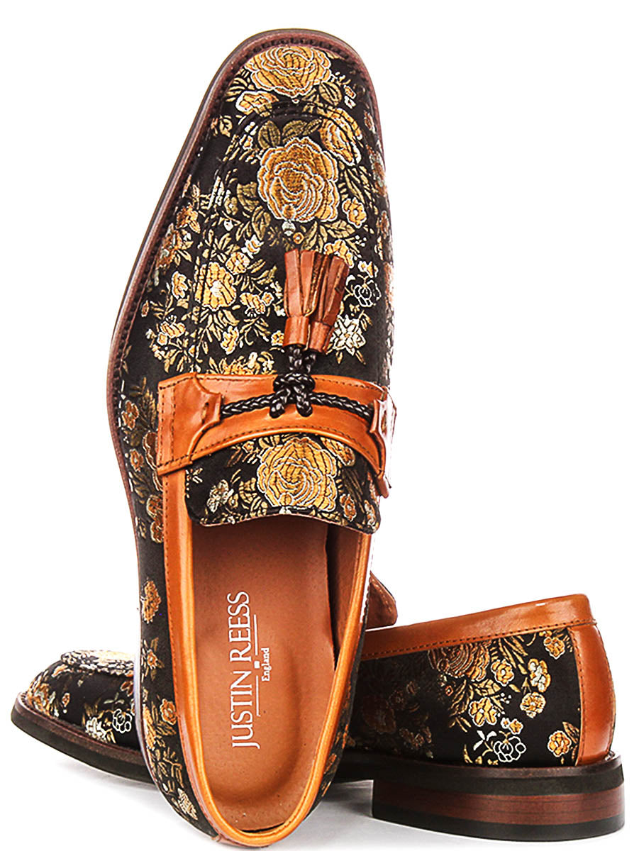Justinreess England Basil In Black Gold For Men Floral Tassle Vintage Loafers