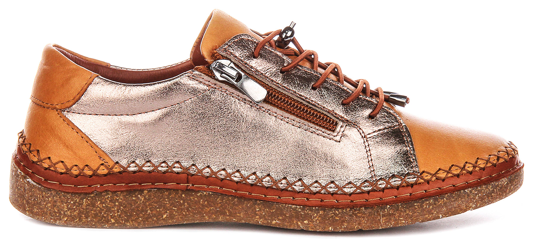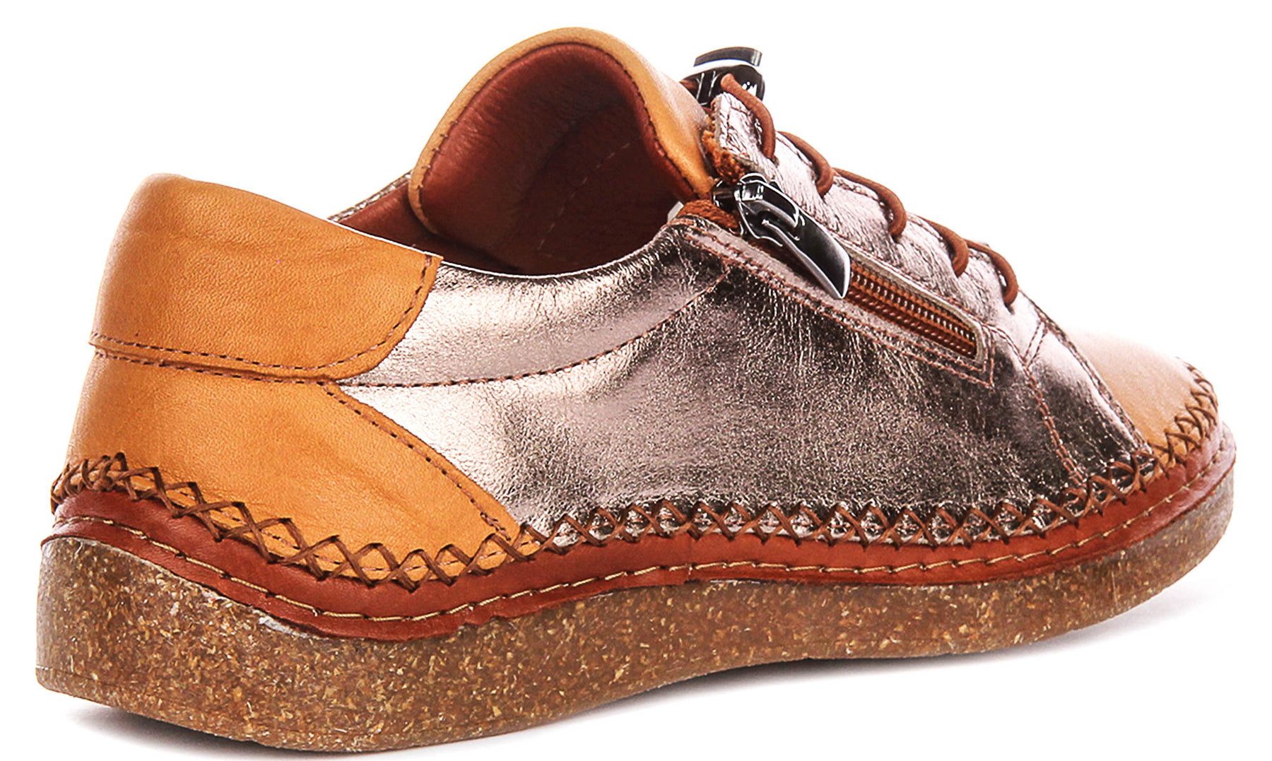 The Kenzie shoes showcase a captivating two-tone design, featuring supple, smooth tan-coloured leather on the toe and heel sections, providing a classic foundation. This is beautifully contrasted by striking metallic bronze-effect leather panels adorning the sides, adding a sophisticated shimmer and a touch of individuality to the overall aesthetic.