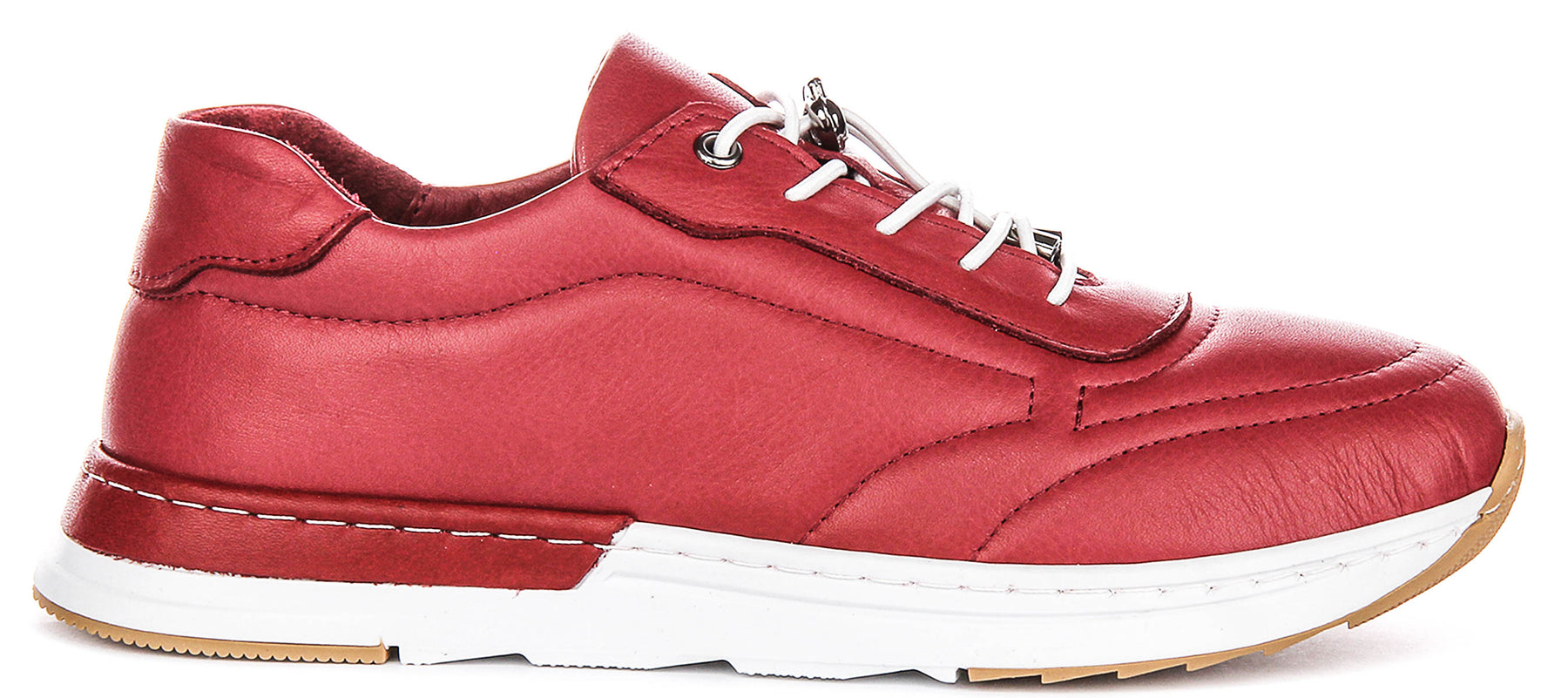 Presented in a rich, deep red hue, these shoes make a bold yet elegant statement. The design is further enhanced by pristine white laces, which are threaded through unique silver-tone metallic toggles, offering a contemporary twist on traditional eyelets. This striking contrast, along with the neat panel stitching across the leather upper, adds textural interest and a refined finish to the overall aesthetic.