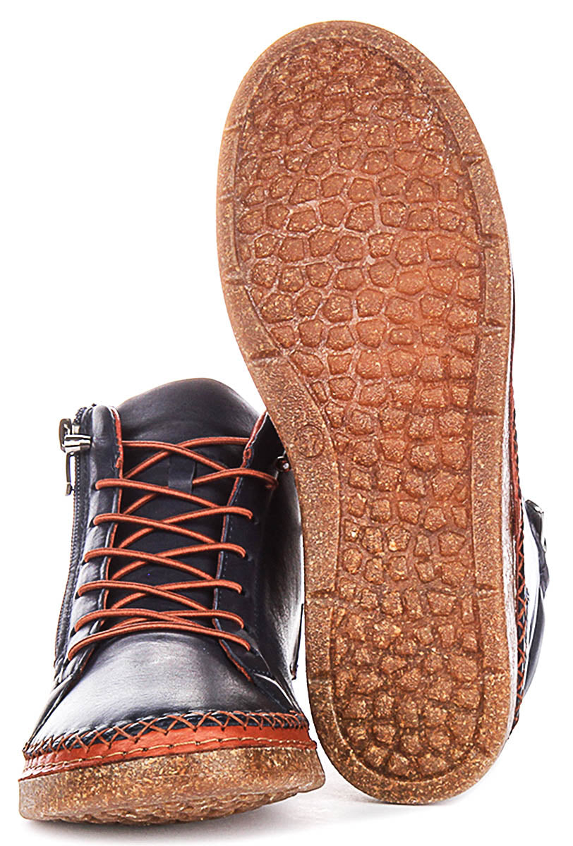 These Justinreess England Kylie boots are an ideal addition to any woman's casual collection, offering both comfort and unique style. Their rich navy and orange colour combination allows for versatile pairing with various outfits, from jeans and trousers to skirts and dresses. Step out in confidence and comfort with these beautifully crafted leather ankle boots.