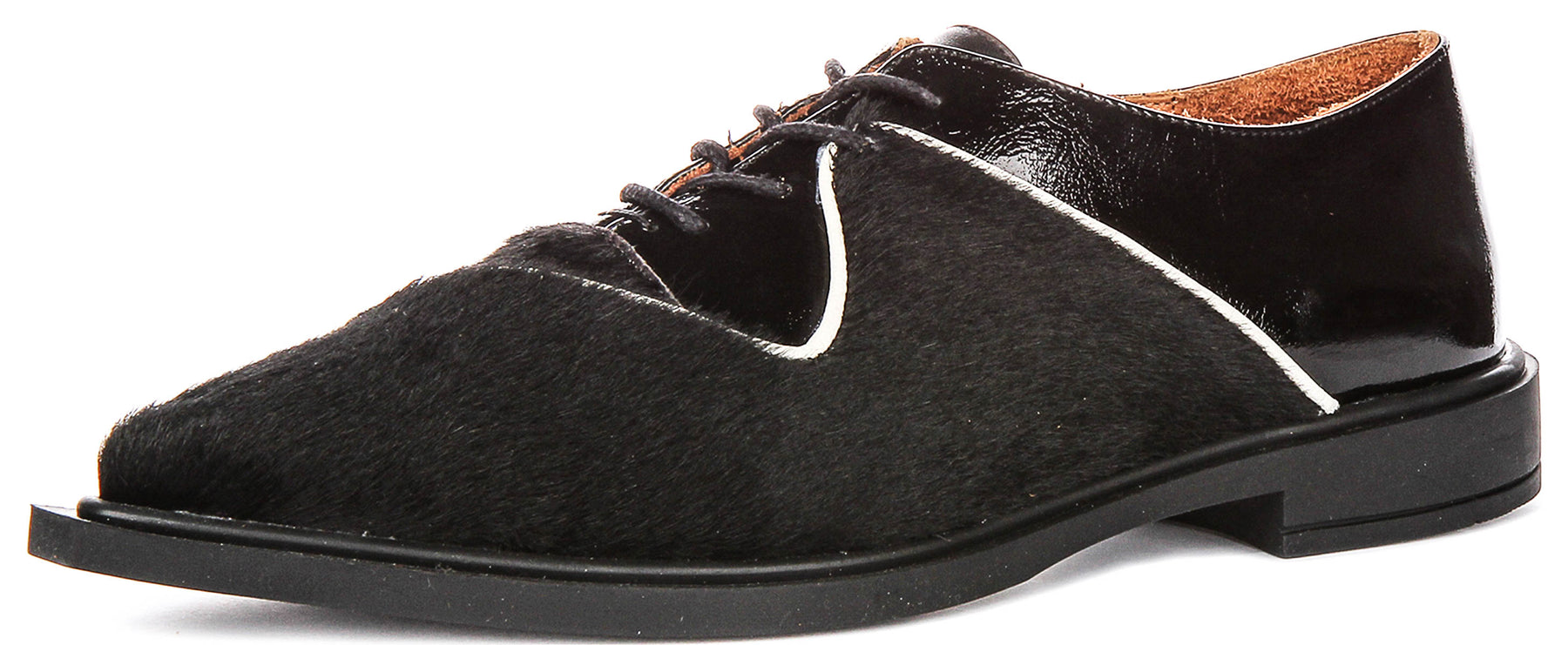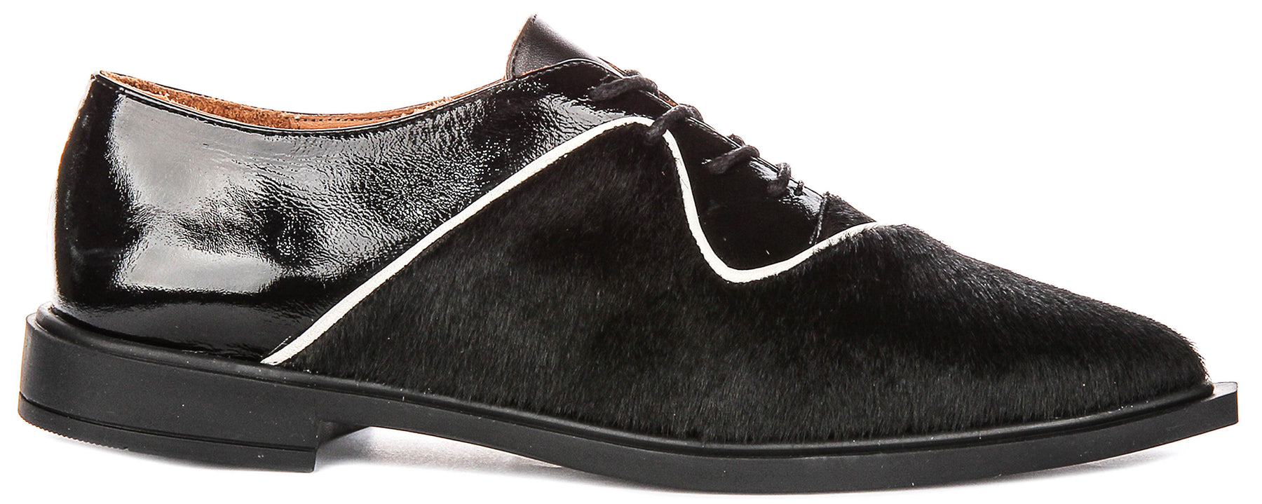 Crafted from premium leather, the Maisie shoes showcase a captivating combination of textures. The main body of the upper features luxurious black pony hair, offering a plush, tactile finish that immediately catches the eye. This is beautifully contrasted with sleek, high-shine black patent leather adorning the heel counter and eyelet sections, providing a polished and elegant counterpoint to the more natural texture.