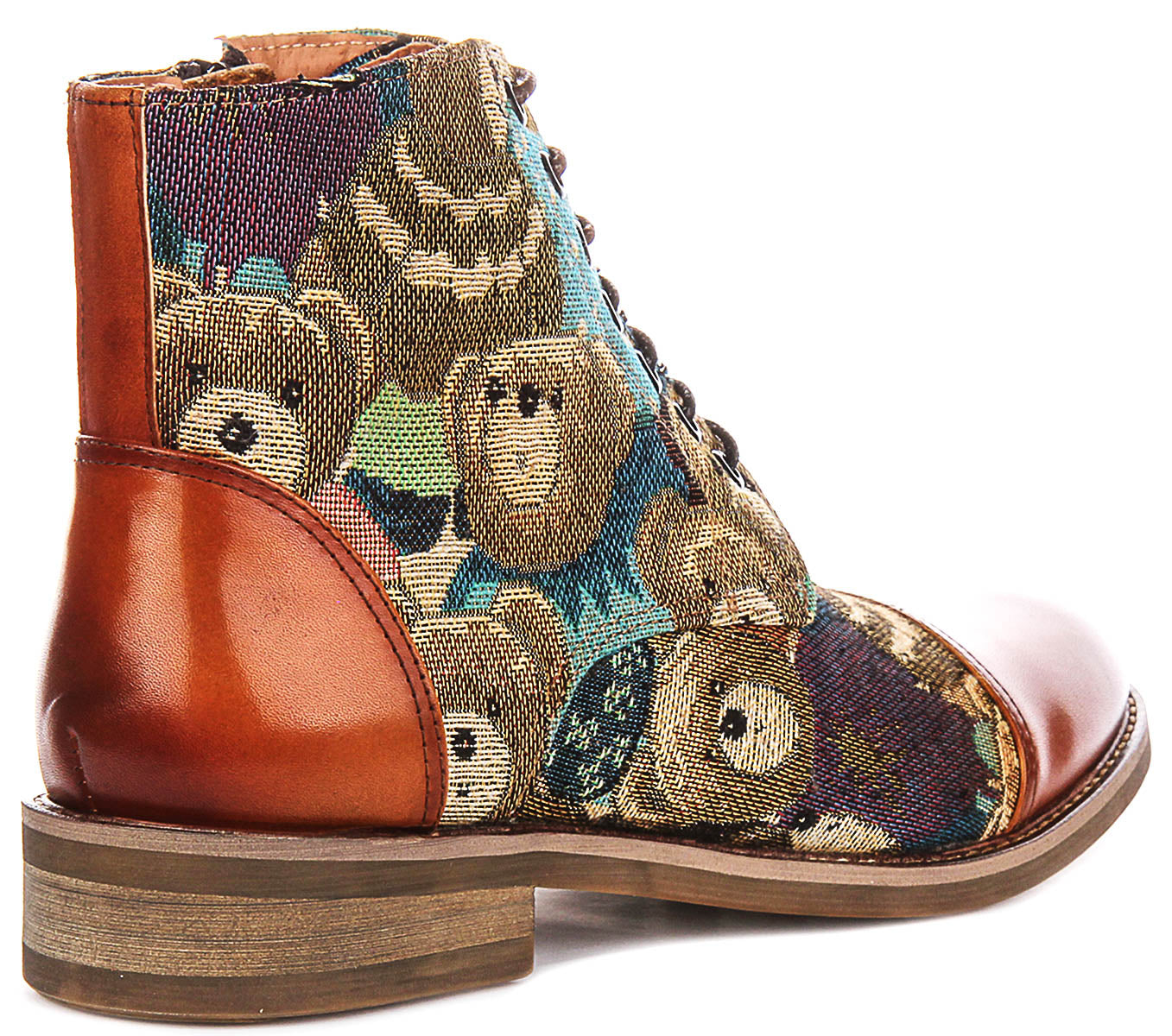 The true highlight of these boots lies in their intricately woven canvas upper, featuring a delightful, whimsical pattern. Adorned with charming teddy bear faces interspersed with abstract shapes and patterns, the fabric boasts a vibrant palette of blues, greens, browns, and subtle hints of purple and gold. This unique tapestry-like design ensures each pair is a conversation starter, exuding personality and flair.