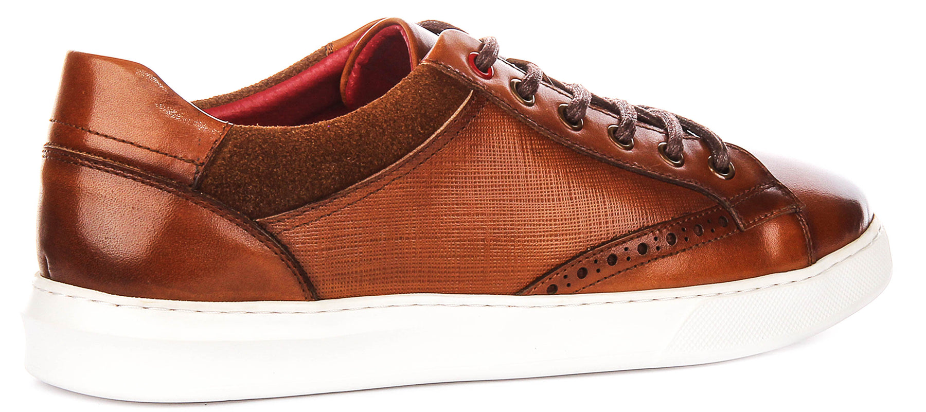 Crafted from exquisite leather, these Justinreess Roland trainers showcase a masterful combination of textures. The toe cap and heel feature a smooth, burnished leather finish that exudes smartness, while the side panels are detailed with a subtle, fine textured leather for added character. A soft, brown suede-like material accents the heel collar, providing a comfortable touch and an interesting material contrast. Adding a touch of traditional flair, delicate brogue-style perforations adorn the mid-section, highlighting the attention to detail in their design. The secure lace-up closure with metallic eyelets ensures a snug and adjustable fit.