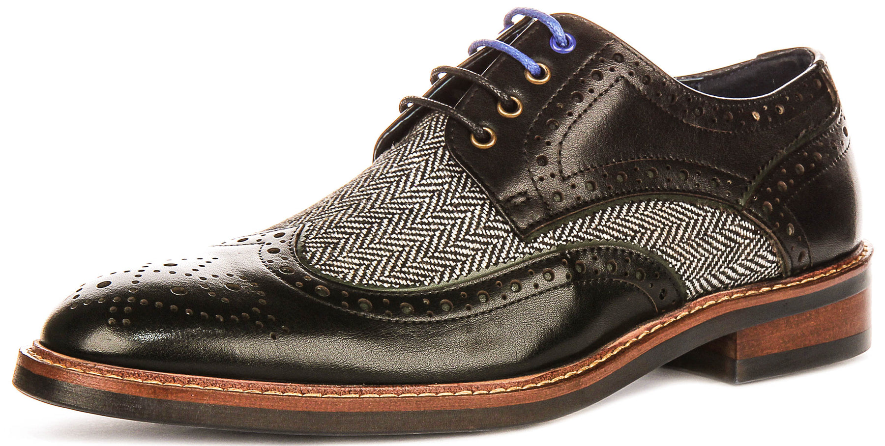 Underfoot, the Sean features a robust sole construction that promises both comfort and longevity. A visible natural-toned welt with meticulous stitching adds to its artisanal charm. The heel is a stacked-look design, combining layers of rich brown and black, which provides a classic profile and steady support. The vibrant blue rubber outsole, embossed with Justinreess England branding and a distinctive circular grip pattern, ensures excellent traction and a confident stride on various surfaces.