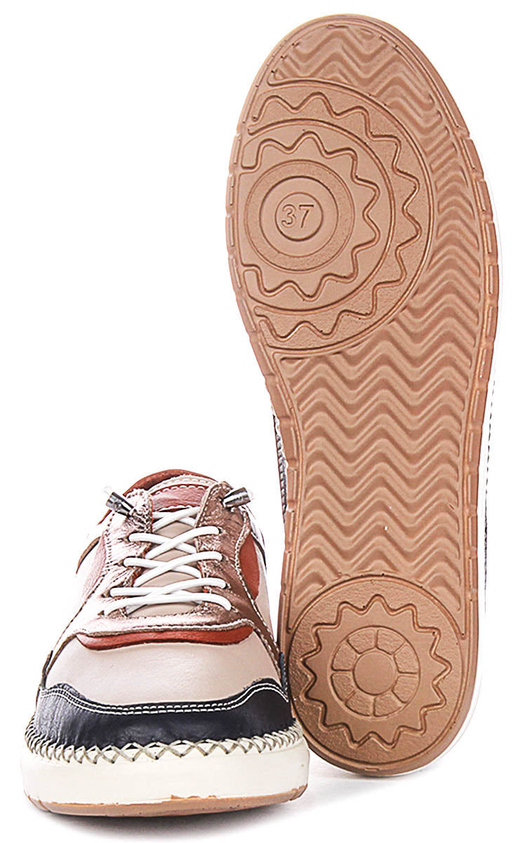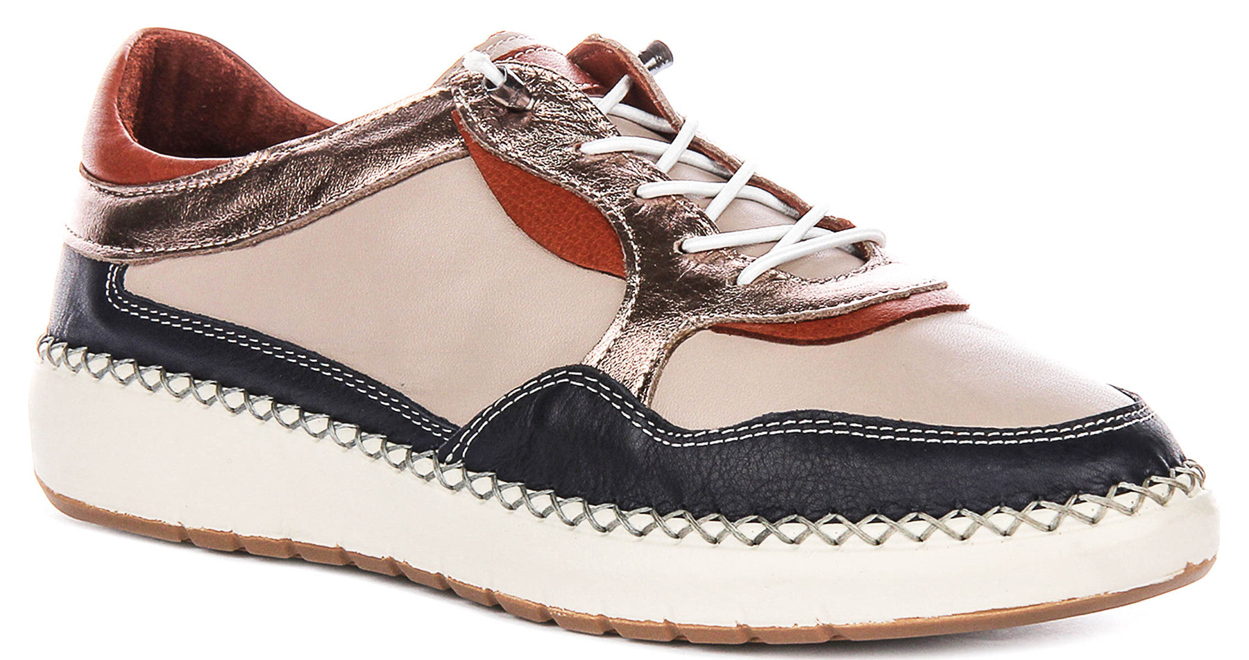 Crafted from premium quality leather, the Taylor shoes feature a sophisticated multi-tonal upper. The main body showcases a smooth, elegant nude or light beige leather, offering a versatile base. This is stylishly contrasted with panels of textured black leather around the toe and sides, providing a subtle depth and visual interest. A striking metallic bronze or rose gold leather highlights the lacing area, adding a touch of glamour and uniqueness to the design. Further accents of warm tan or cognac brown leather appear on the heel collar and subtly beneath the metallic lacing panel, creating a rich and varied colour palette.
