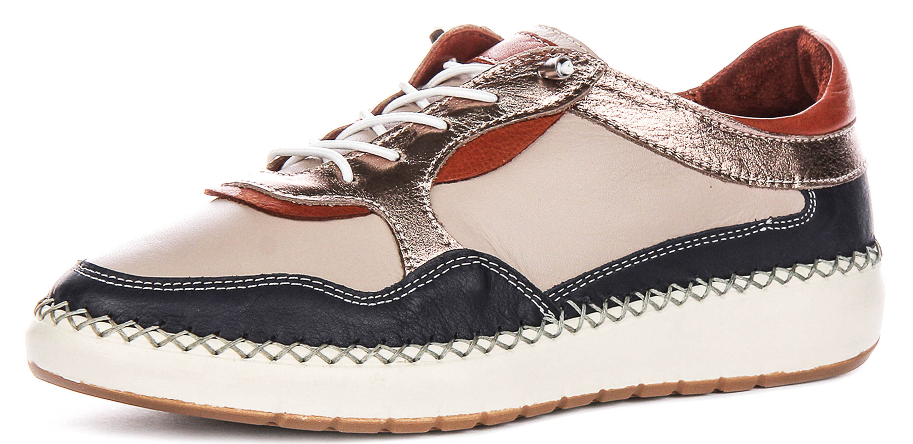 The design is accentuated by crisp white stitching that contrasts beautifully against the darker leather sections, adding a handcrafted feel. A classic white lace-up closure ensures a secure and adjustable fit, with polished metallic eyelets complementing the bronze leather detailing. These shoes are built upon a comfortable platform-style sole, featuring a clean white midsole that visually separates the upper from the ground. A distinctive decorative criss-cross stitching pattern in a light thread elegantly borders the top edge of the sole, enhancing its unique character.
